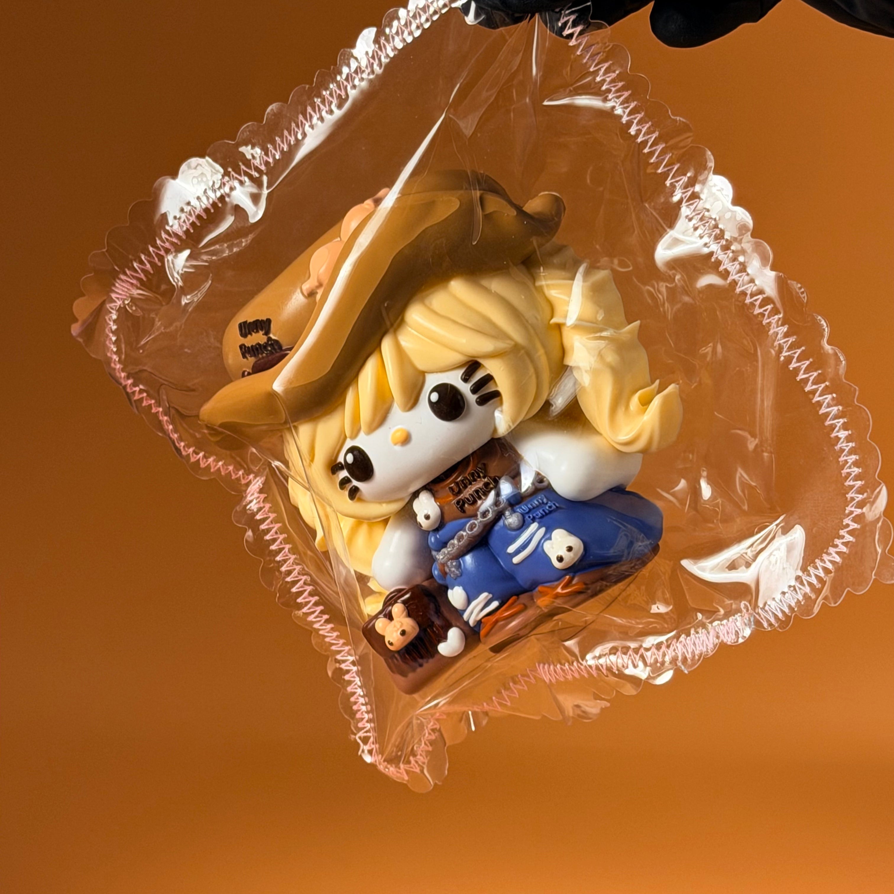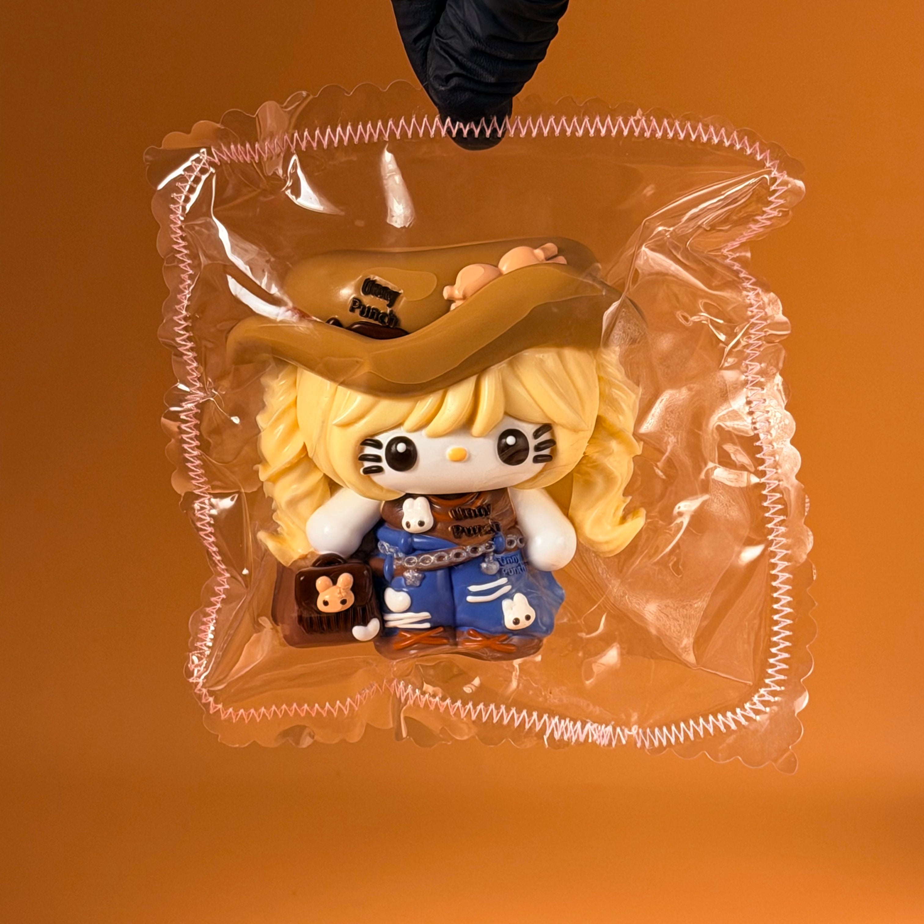 • COWBOY HELLO KITTY STYLE: Western-inspired Hello Kitty design featuring a cowboy hat, denim-style outfit, and travel-themed accessories for a playful collectible look.